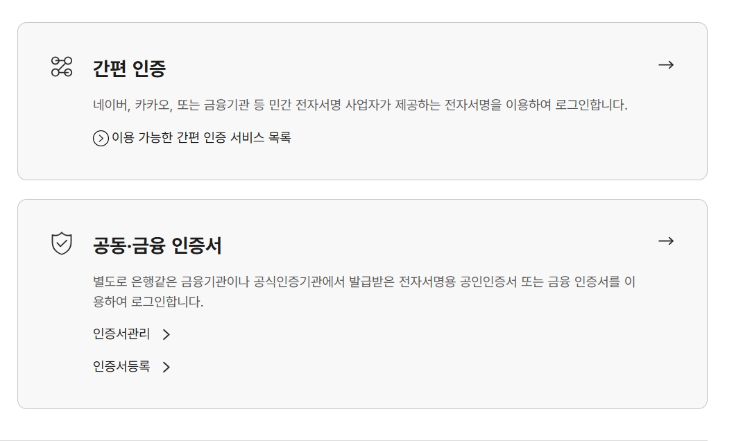 - 공동인증서(구 공인인증서) 또는 간편 인증으로 로그인