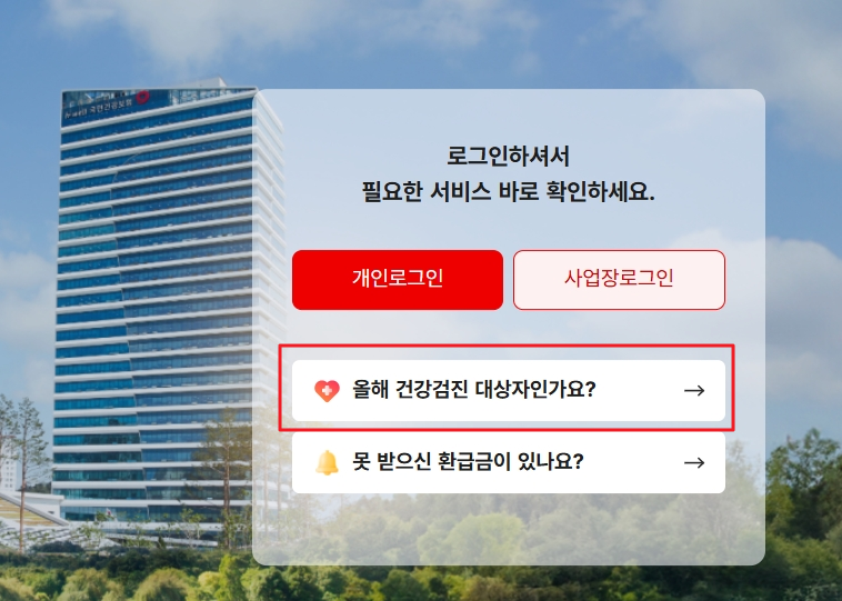 | 일반 건강검진 | 만 20세 이상 직장가입자, 피부양자, 지역가입자 | 사무직 2년 1회, 비사무직 매년 |