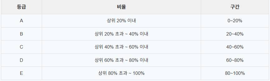각 과목별로 석차 백분율을 계산해 등급(A~E)을 부여합니다. - 내신 평균 등급 산출 공식