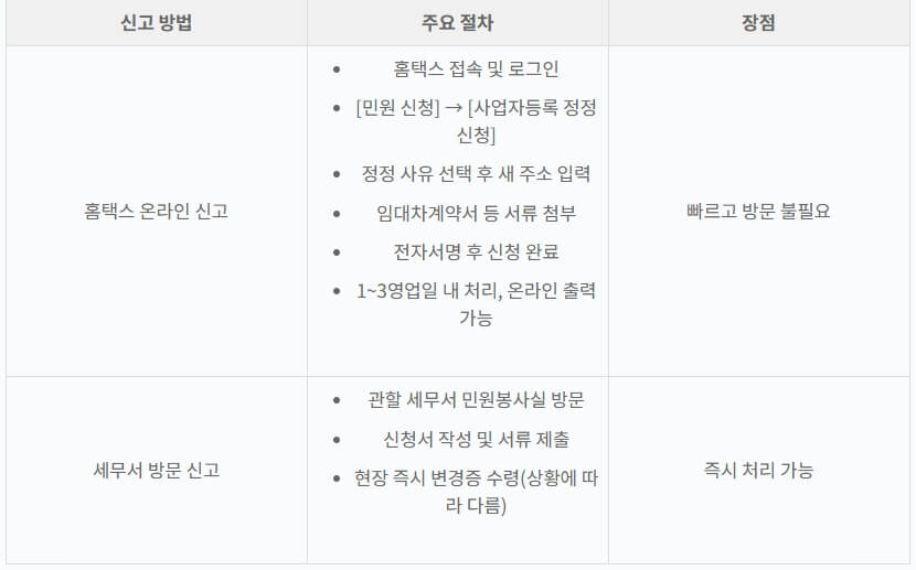 - 법인사업자는 등기부 주소 변경 후 2주 이내 정정 신고 필요[6]