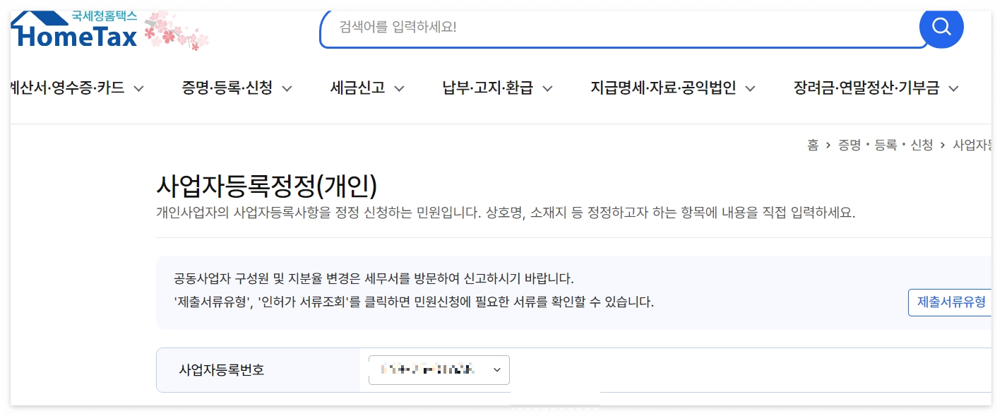 - 상단 메뉴에서 민원 신청 → 사업자등록 정정 신청 클릭