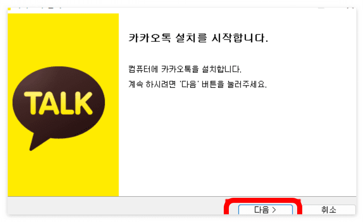 - 설치 시작: 카카오톡 설치 마법사가 시작됩니다. '다음' 버튼을 클릭하여 설치를 계속 진행합니다.